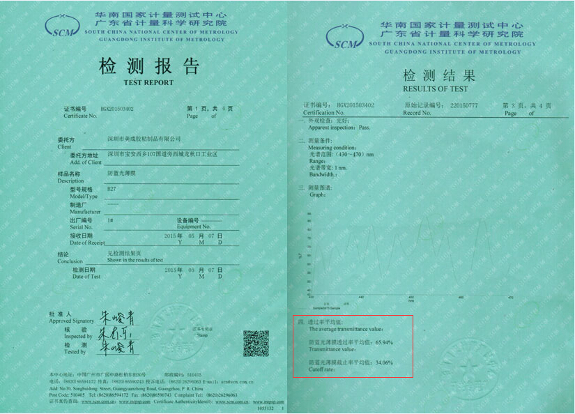 我們把真正具有防藍光效果的薄膜貼合在鋼化玻璃上,經實際檢測是可以有效阻隔藍光30%的